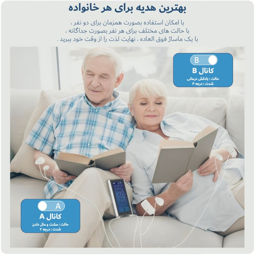 دستگاه دارای ۲ کانال خروجی A و B است که قابلیت تنظیم بصورت مجزا را دارند.در واقع میتوانید برای هر کانال برنامه جداگانه با شدت دلخواه تنظیم کنید و برای دو نقطه مختلف بدن و یا برای دو نفر بصورت همزمان استفاده کنید.