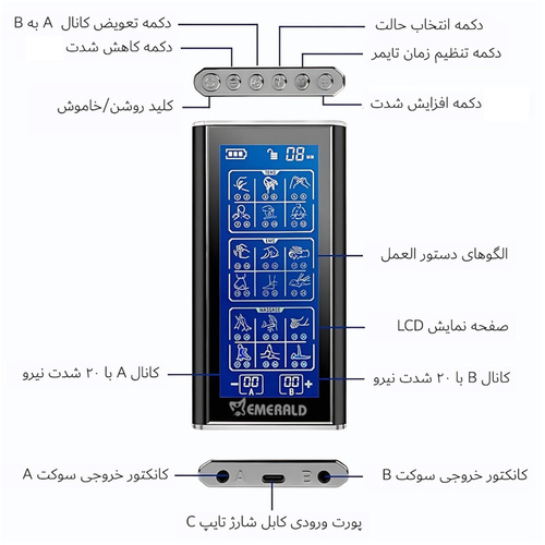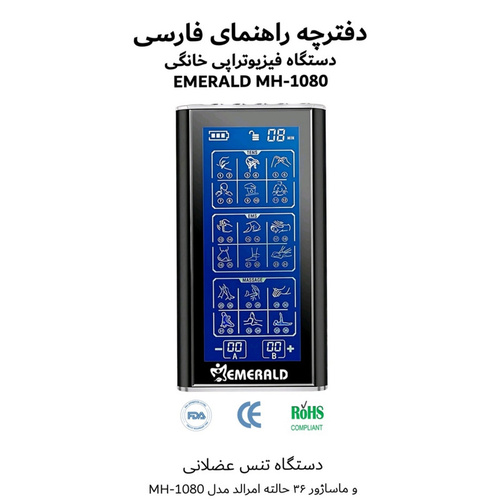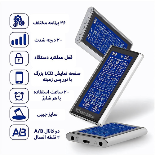 سایر توضیحاتدستگاه امرالد ۱۰۸۷ با سه قابلیت مجزا و ۳۶ برنامه پیش فرض با فرکانسهای مختلف و طول موجهای متفاوت باعث تحریک و برانگیختگی کانالهای عصبی و ماهیچه ها شده و با ارسال فرکانس با طول موج مناسب باعث التیام درد (حالت TENS) ،برانگیختگی و منبسط و منقبض شدن عضلات(حالت ESM) و نیز سکون و آرام کردن عضلات